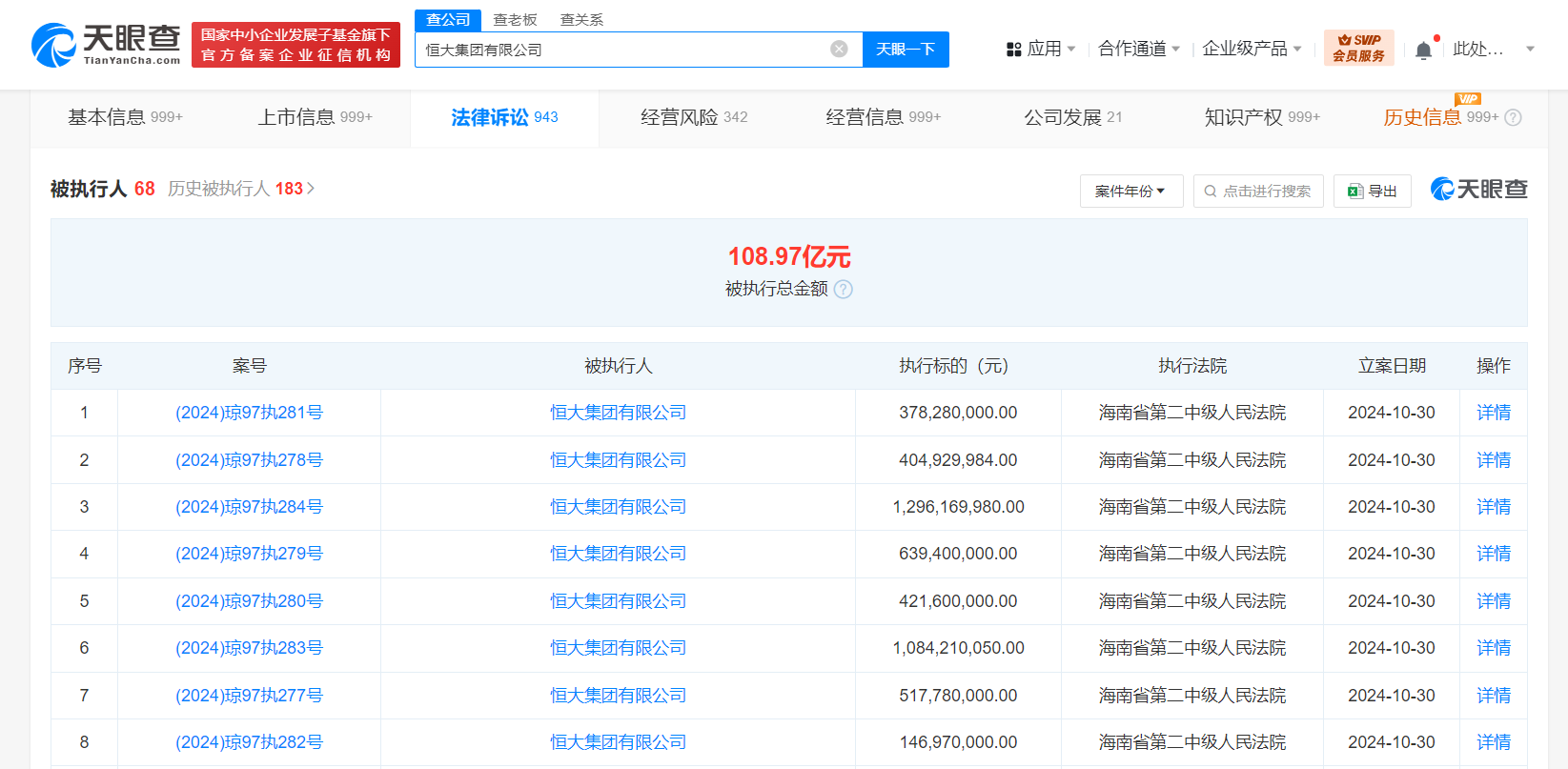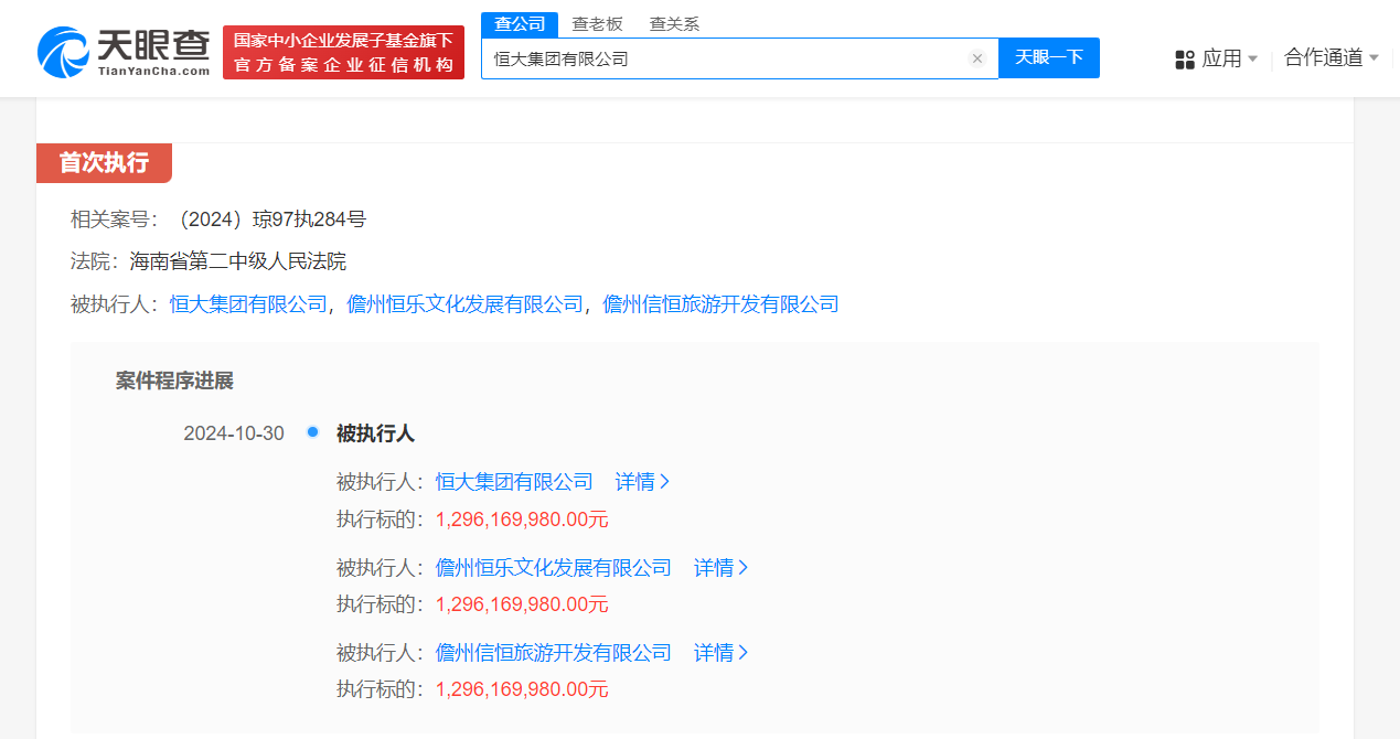 此外,10月30日,恒大集团有限公司新增8条被执行人信息,执行标的合计48.89亿余元,涉及金融借款合同纠纷案件,被执行人还包括儋州恒乐文化发展有限公司、儋州信恒旅游开发有限公司等,执行法院为海南省第二中级人民法院。风险信息显示,恒大集团有限公司现存68条被执行人信息,被执行总金额超108亿元。此外,该公司还存在多条限制消费令、失信被执行人(老赖)和终本案件信息。