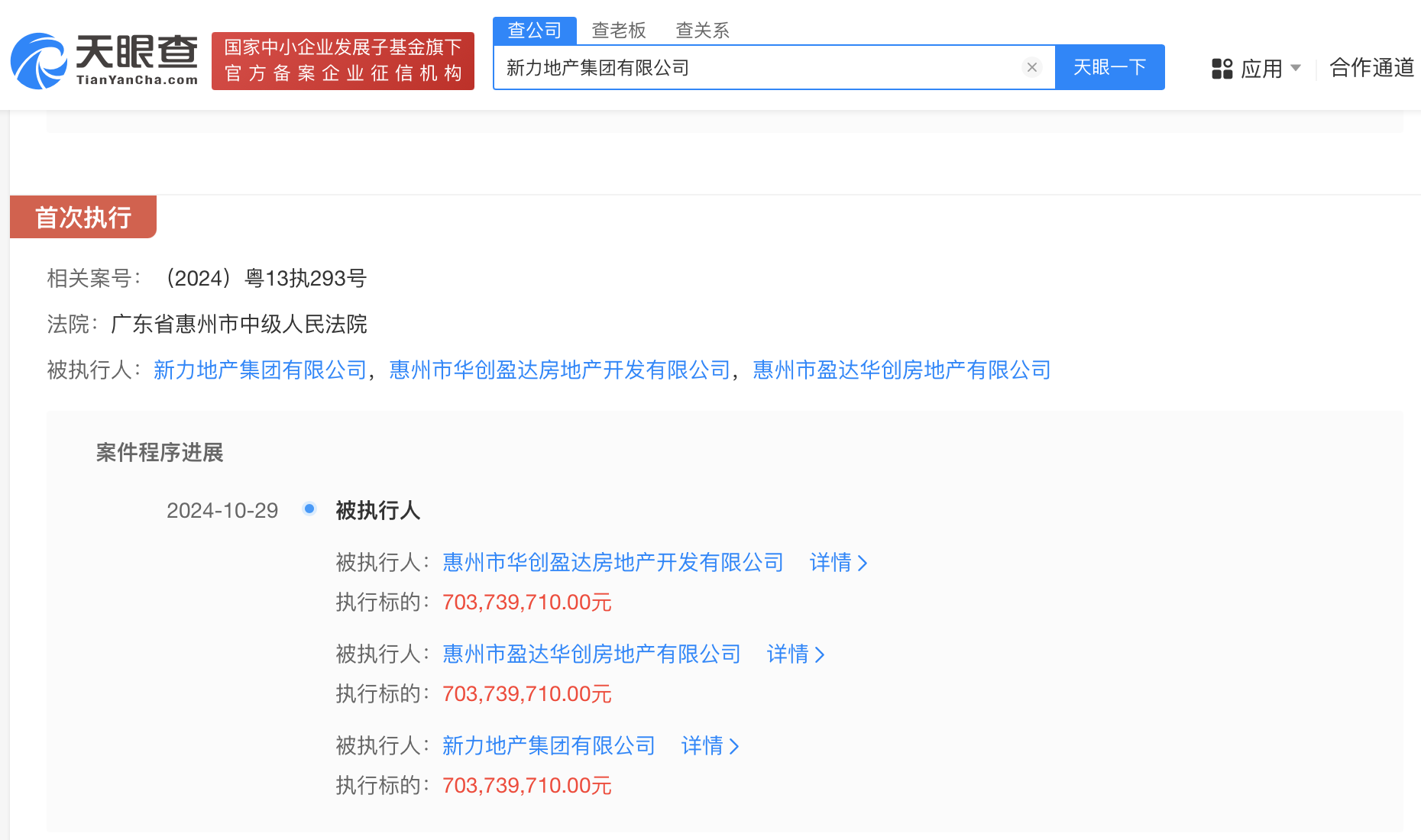 信息显示,新力地产集团有限公司新增2条被执行人信息,执行标的合计7亿余元,涉及票据追索权纠纷、金融借款合同纠纷案件,部分案件被执行人还包括惠州市华创盈达房地产开发有限公司、惠州市盈达华创房地产有限公司等,执行法院为广东省惠州市中级人民法院、上海市普陀区人民法院。