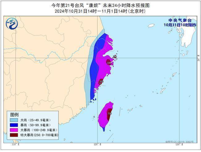 降水预报:10月31日14时至11月1日14时,福建东北部、浙江中东部、上海、江苏南部等地有暴雨或大暴雨,其中,福建东北部、浙江东部等地局地有特大暴雨(250-300毫米);台湾岛有大暴雨,其中台湾岛东部局地有特大暴雨(250-700毫米)。与历史同期相比,上述地区降水具有极端性。