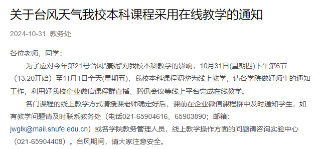 10月31日中午,澎湃新闻记者从上海财经大学工作人员处获悉,该校已发布课程调整通知:为了应对今年第21号台风“康妮”对我校本科教学的影响,10月31日(星期四)下午第6节(13:20开始)至11月1日全天(星期五),我校本科课程调整为线上教学,请各学院做好师生的通知工作,利用好我校企业微信课程群直播、腾讯会议等线上平台完成在线教学。