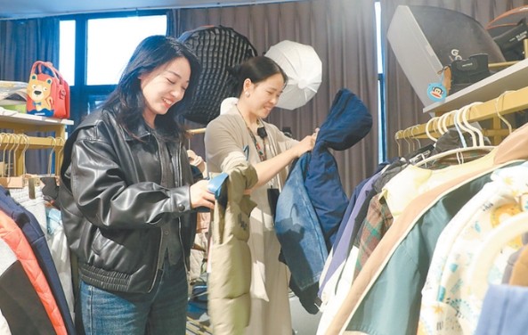 本报记者(左)正与童装主播一起学习如何将衣服分类 本报记者 李新华 摄