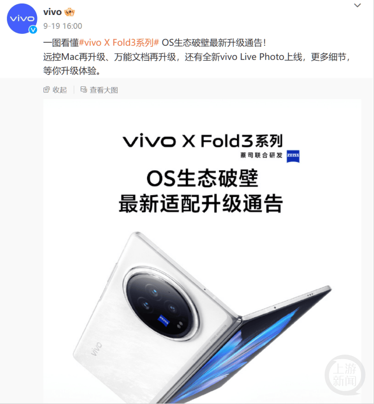 事实上,多个国产品牌早已“瞄准”苹果开发了类似的产品和服务。今年3月,vivo发布的折叠旗舰vivo X Fold3系列支持手机、平板、网页、Windows、Mac五端协同,vivo万能文档可打开Pages、Numbers、Keynote等57种专业文件格式,并支持格式转换;9月,vivo发布了OS生态破壁最新适配升级通告,支持vivo X Fold3系列远程控制Mac,实现文件的远程下载与上传;上线了vivo Live Photo,允许用户拍摄与发布小红书Live图,并支持打开iOS的Live Photo格式照片。