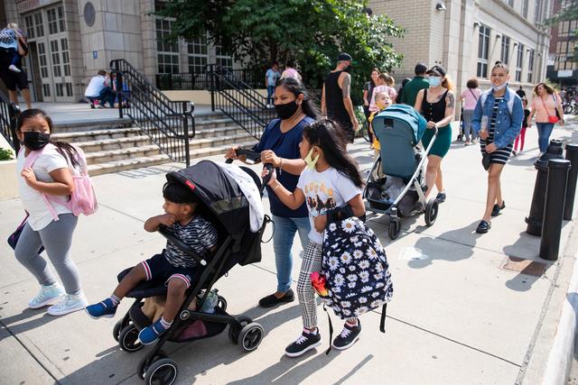 2021年9月13日,家长在美国纽约一所公立学校外接学生放学。新华社发