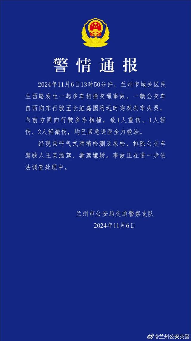 兰州一公交车刹车失灵与多车相撞,致4人受伤 兰州公安交警 2024-11-06 5318 兰州公安交警通报,11月6日13时50分许,兰州市城关区民主西路发生一起多车相撞交通事故。一辆公交车自西向东行驶至长虹嘉园附近时突然刹车失灵,与前方同向行驶多车相撞,致1人重伤、1人轻伤、2人轻微伤,均已紧急送医全力救治。经现场呼气式酒精检测及尿检,排除公交车驾驶人王某酒驾、毒驾嫌疑。事故正在进一步依法调查处理中。 (兰州公安交警) 责任编辑:帅为
