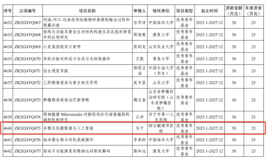 近日,山东省科技厅公示了2024年度山东省自然科学基金项目立项,烟台毓璜顶医院医学影像科毛宁申报的“多模态乳腺影像与人工智能”项目获批优秀青年基金。这是毓璜顶医院首次获批该类人才项目,是该院在青年人才培养方面取得的又一重大成果。
