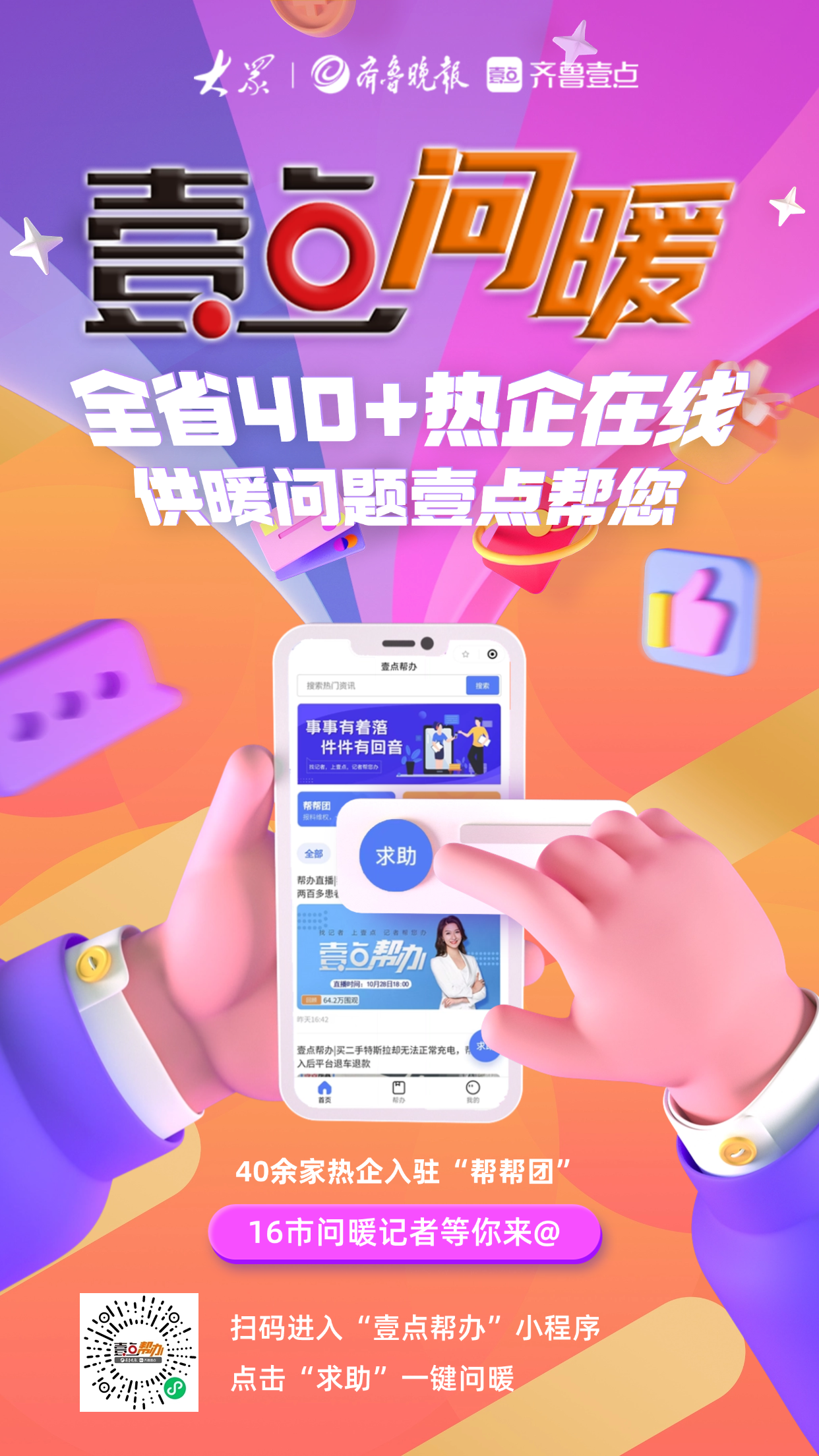 与此同时,供暖季期间,齐鲁晚报·齐鲁壹点“壹点帮办”栏目将继续推出“问暖”系列报道。如果您在这个供暖季遇到了暖气不热等供暖问题,可随时在线@壹点帮办记者,我们将以视频、直播、图文等形式全方位报道,为您搭建起与热企以及有关部门之间的沟通桥梁,帮您排忧解难。