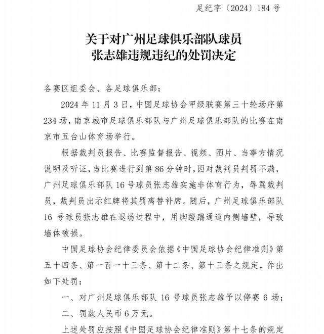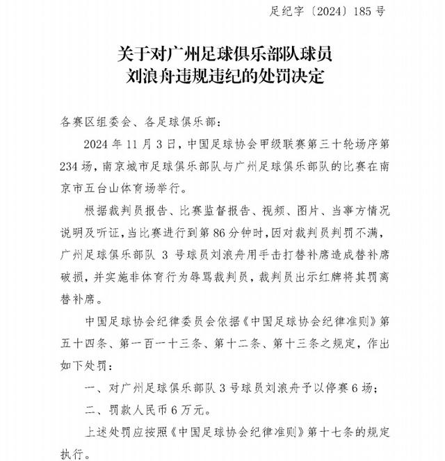 11月7日,足协官方通报了广州对阵南京城市比赛中,广州球员刘浪舟、张志雄的处罚,两人均停赛6场、罚款6万。