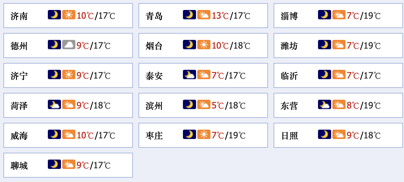 最低气温:德州、聊城、菏泽、济宁和沿海地区8℃左右,其他地区6℃左右。