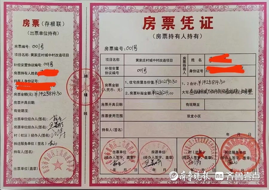 发放仪式在上高街道黄家庄城中村改造项目举行,活动现场发出了首张“001号”房票。该房票显示,住宅房屋总价值1302190.5元,房票补贴金额为123624元,总金额为1425814.5元。首张房票的发放,意味着打响了泰山区实施房票安置的“第一枪”。