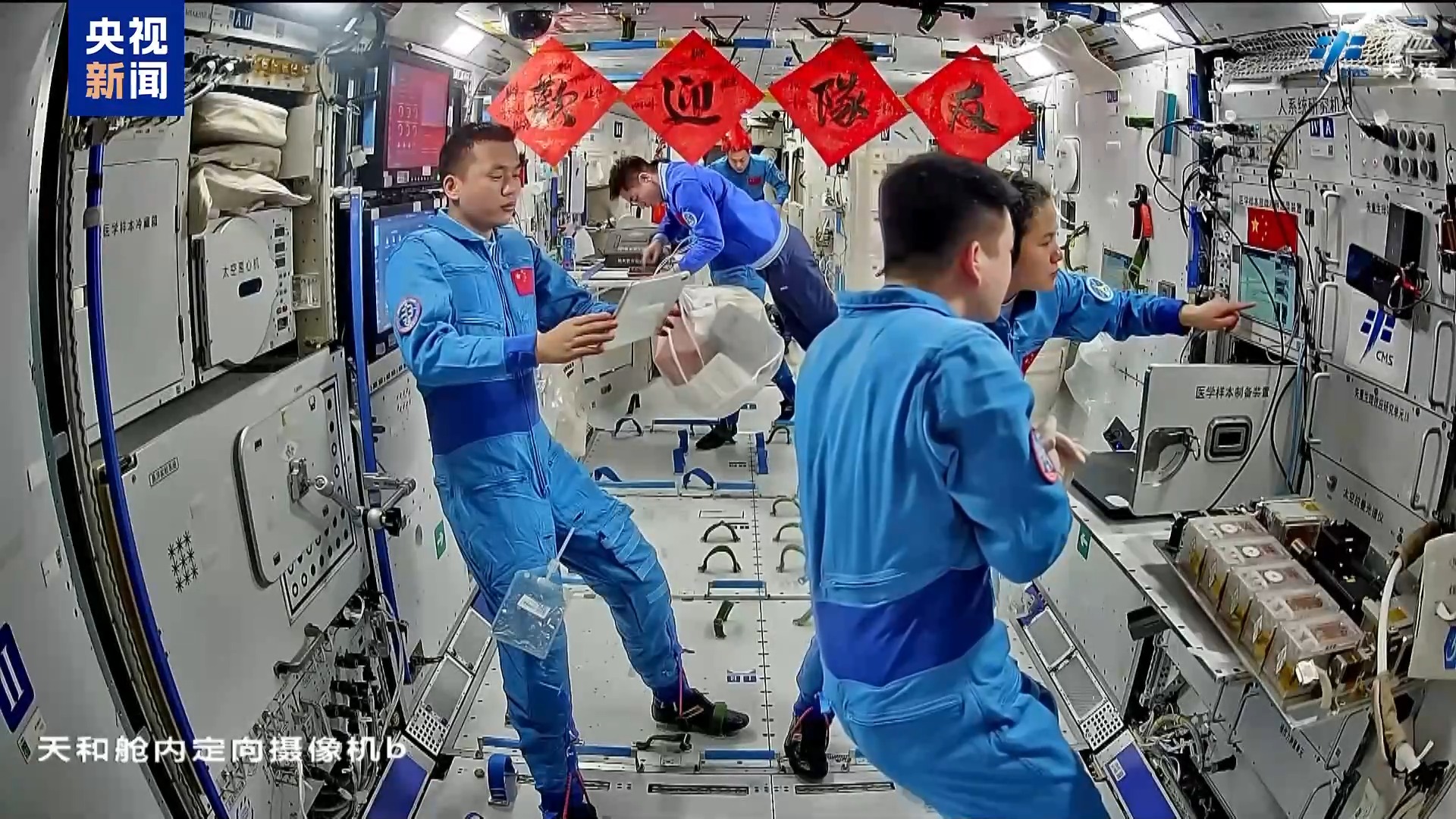 在轨轮换期间,6名航天员合理分工、密切协同、全面交接,完成了包括载人飞船上行物品转移与清理、飞行器飞行状态设置,以及延续性工作项目、站内设施设备及操作使用注意事项、地面重要通话内容和要求等事项的全面交接,确保后续各项工作顺利开展。
