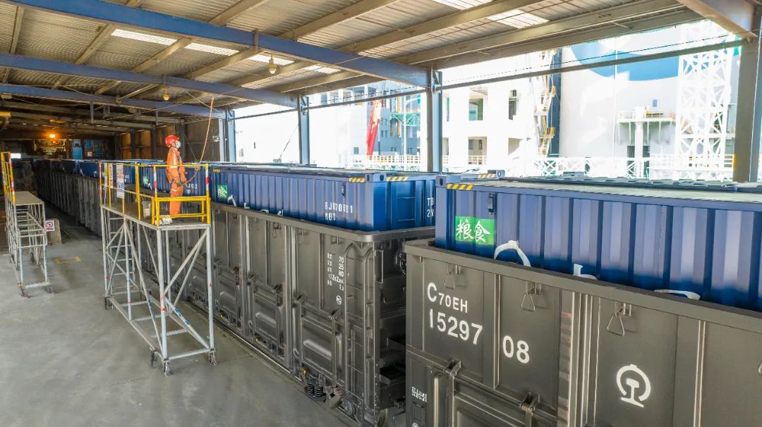 山东港口首发!顶开门集装箱散粮运输专列从日照港开行