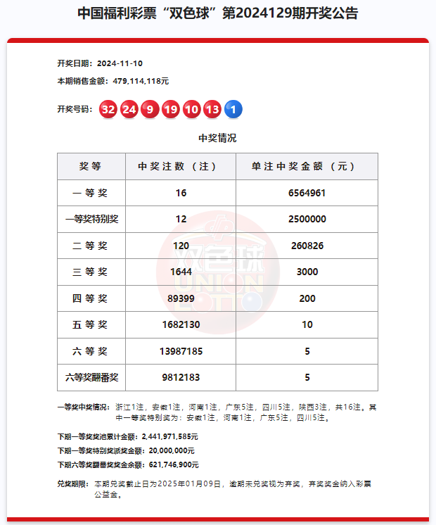 双色球2024129期中出一等奖16注筹集公益金1.72亿元 大众报业·齐鲁壹点 2024-11-11 4.5万 双色球开奖 第2024129期 11月10日 开奖号码 一等奖 浙江(1注)安徽(1注)河南(1注)广东(5注) 四川(5注)陕西(3注) 奖池金额24.41亿元 本期销量 4.79亿元 筹集公益金 1.72亿元 (点击图片可放大查看) 量力而行 理性购彩 (来源:“中国福彩”微信公众号) 责任编辑:姜素坤