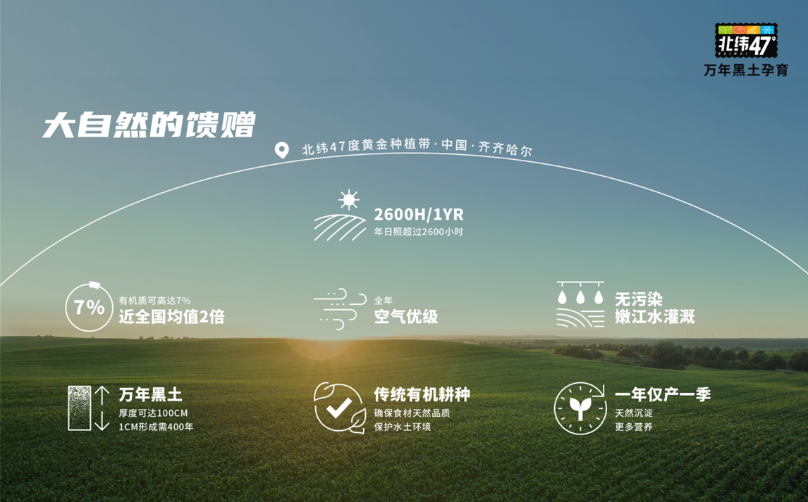 “北纬47°”品牌因地处北纬47度“黄金”种植带而得名。这里拥有世界仅存的三大黑土带之一,被誉为“耕地中的大熊猫”。北纬47°的种植及加工产区均在黑土带核心区域,黑土层厚达1米,形成需要4万年,黑土有机质含量高达7%,是全国均值的2倍,特别有利于玉米等粮食作物的生长。同时,这里的冬夏温差高达70℃,年均日照2600小时,0污染的嫩江水质和全年优级的空气质量等优势条件,都为“北纬47°”玉米提供了理想的生长环境。