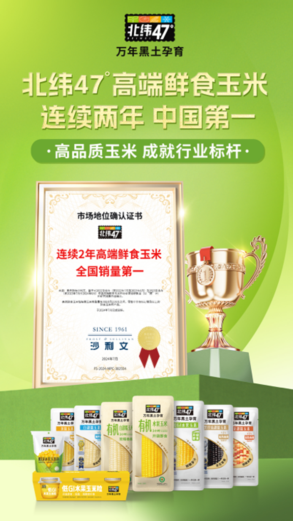 近日,全球增长咨询公司“弗若斯特沙利文”(Frost &Sullivan,以下简称“沙利文”)再次确认绿色有机食品品牌“北纬47°”高端鲜食玉米连续两年全国销量第一,继续以冠军之姿领跑鲜食玉米市场。