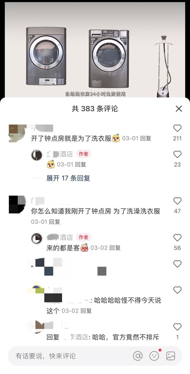 在社交平台上,某酒店官方甚至“亲自下场”,给网友们发了视频版攻略,教大家如何使用自家酒店的洗衣房。在评论区,酒店的官方账号回复网友称:“来的都是客。”