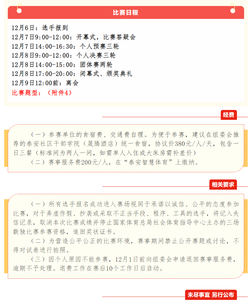 参赛者于12月6日22:00前到泰安社区干部学院(晟腾酒店)完成报到,报到需持二代身份证、查验《参赛责任书》(附件1)及《个人健康承诺书》(附件2)及个人保险(包含比赛往返期间),未购买保险者无法参赛。比赛期间因参赛者身体健康等原因所导致的一切后果,均由组队单位和(或)参赛队员本人负责。