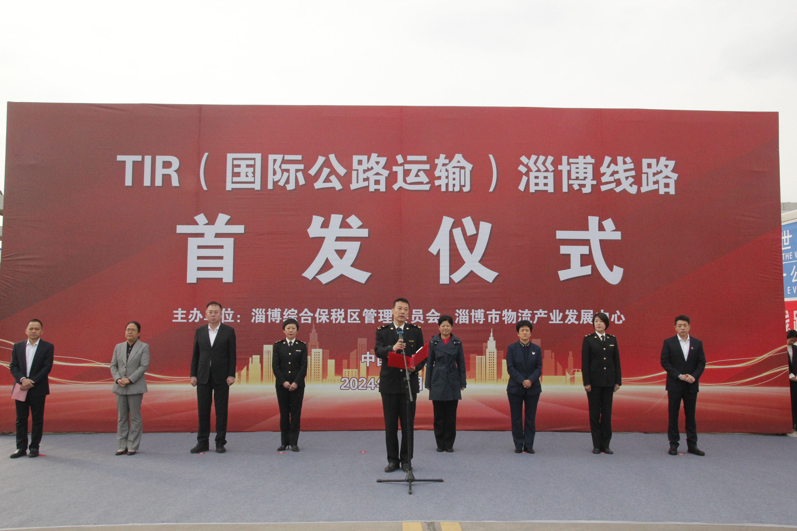 11月18日下午,淄博市首辆TIR(国际公路运输)车辆从淄博保税监管场站发出并举行首发仪式。淄博综合保税区工委副书记、管委会主任徐庆堂主持,淄博市政府副市长胡晓鸿、济南海关副关长张瑞宏发表讲话并为“TIR淄博集结中心”揭牌。淄博海关、市直有关部门、淄博综合保税区有关领导,淄博部分大型进出口企业代表等50余人出席首发仪式。