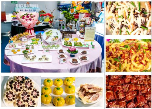 通过前期与济南大学文化与旅游学院(烹饪学院)的深入研究探讨,本次比赛所呈现的菜品无论是从食材选择、加工制作还是营养膳食,都经过了科学的考量和设计。餐饮公司参赛团队以“梦想与丰收的盛宴”为展台主题,通过现场精烹细灼的美味制作,呈现出了飘香四溢的闽南金牌稻香肉、港式风味的香辣炸鱿鱼以及养生健康的养生鸡枞菌炒山药的热菜系列;精美别致的枣花酥、生动逼真的象形南瓜和外酥里嫩的冰花锅贴的面点系列;以“荷之韵”为主题,巧妙融合了泉城济南市花-荷花的独特风情冷菜拼盘系列,为评委带来清新爽口的视觉、味觉盛宴。