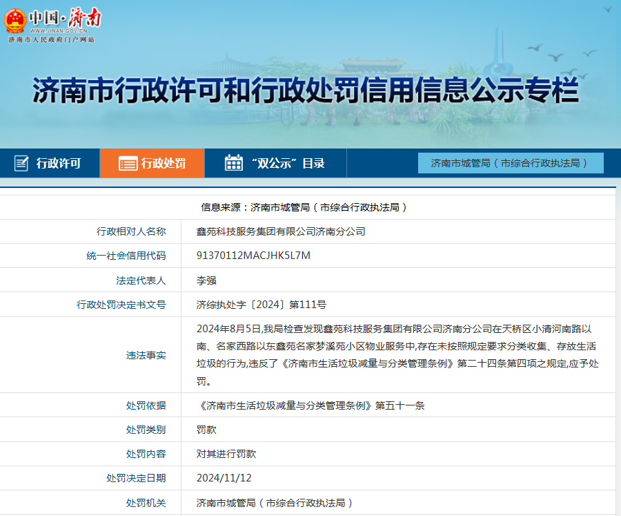 处罚信息显示,2024年8月5日,济南市城管局(市综合行政执法局)检查发现鑫苑科技服务集团有限公司济南分公司在天桥区小清河南路以南、名家西路以东鑫苑名家梦溪苑小区物业服务中,存在未按照规定要求分类收集、存放生活垃圾的行为,违反了《济南市生活垃圾减量与分类管理条例》第二十四条第四项之规定,应予处罚。