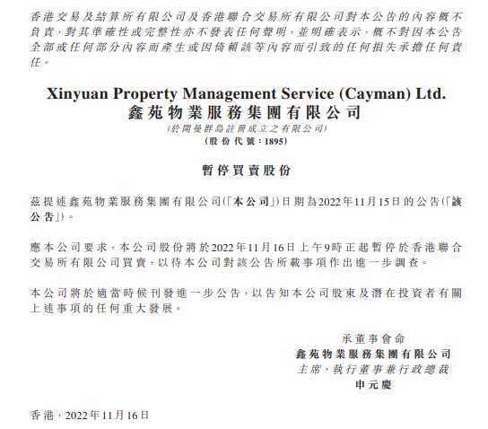 此外,据鑫苑服务(01895.HK)此前公告,鑫苑服务2022年11月16日起停牌。起因是当时该公司进行年末资产审查及制订预算程序的过程中,发现全资子公司鑫苑科技存置于银行的约4.02亿元的定期存款被质押,作为其控股股东鑫苑地产控股的子公司以及若干并非鑫苑服务旗下公司的贷款融资的抵押品。联交所要求鑫苑服务对未经授权的抵押事项展开独立法证调查,评估对鑫苑服务业务运营和财务状况的影响、公布调查结果、并采取适当的补救措施。