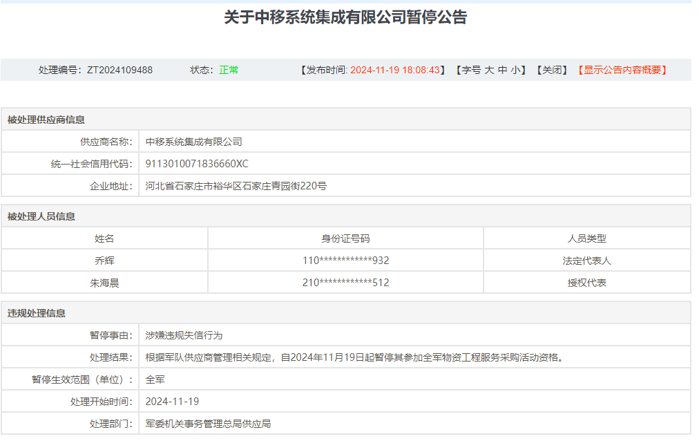 中移系统集成有限公司涉嫌违规失信行为被军采网暂停采购资格 大众报业·齐鲁壹点 2024-11-21 2.1万 11月19日,军队采购网发布关于中移系统集成有限公司暂停公告。 经调查,中移系统集成有限公司在参加某领域数据融合平台建设(项目编号:2021-VQ01- F2084(1))项目采购活动中,涉嫌存在违规失信行为。 根据军队供应商管理相关规定,自2024年11月19日起暂停其参加全军物资工程服务采购活动资格。 责任编辑:刘阿龙