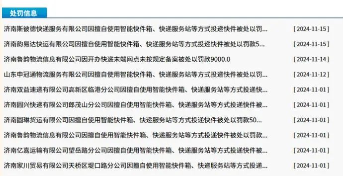 进入11月后,济南市邮政管理局连续针对快递企业擅自使用智能快件箱、快递服务站等方式投递快件行为开出9张罚单,涉及圆通、韵达、中通、极兔等多家品牌企业,每单处罚金额均为500元。