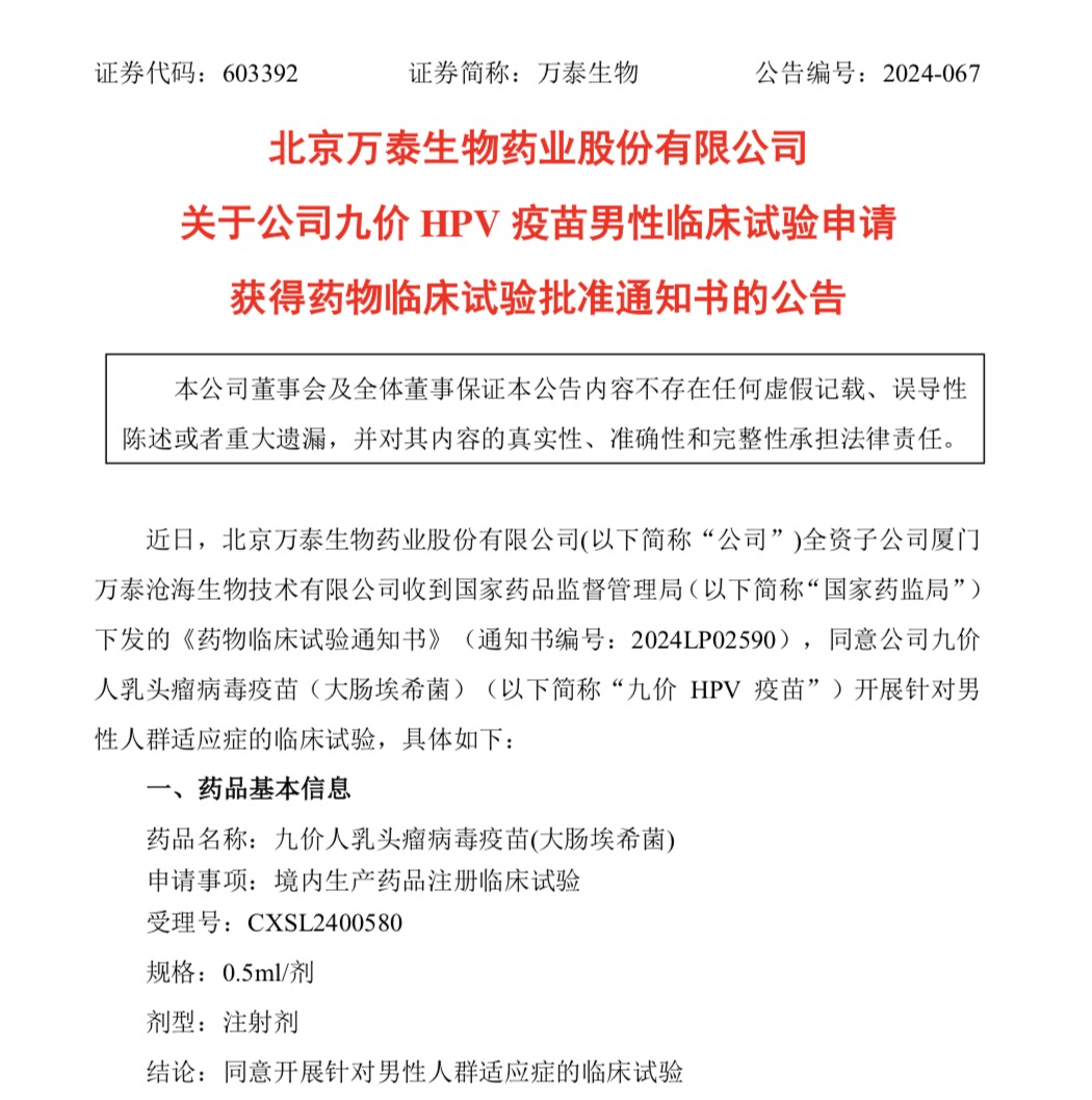 公告中介绍,北京万泰生物药业股份有限公司全资子公司厦门万泰沧海生物技术有限公司收到国家药品监督管理局下发的《药物临床试验通知书》,同意公司九价人乳头瘤病毒疫苗(大肠埃希菌)开展针对男性人群适应症的临床试验。