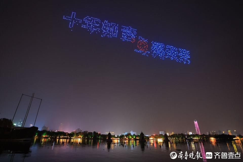 11月23日晚7点,800架无人机在大明湖北极阁广场腾空而起,用一幅幅璀璨夺目的画面庆贺齐鲁壹点十周岁生日。
