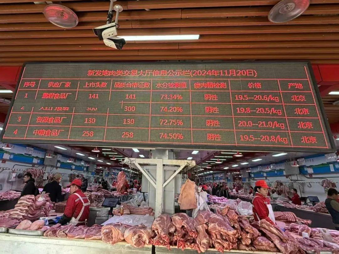 为一探究竟,11月20日,中国三农发布记者来到北京市新发地农产品批发市场,在肉类交易大厅门口的屏幕上滚动着每天更新的信息公示栏,可以看到,当天共有来自10家供应厂家的2011头检验合格的生猪。