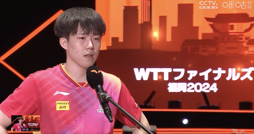 11月24日下午,WTT福冈总决赛男子单打决赛,王楚钦4:0战胜张本智和,夺得冠军!王楚钦连续三年WTT总决赛战胜张本智和,夺冠后也锁定了年终世界第一。王楚钦夺冠后,赛后采访时表示:“这次是以挑战者的姿态参与比赛。2024是不平凡的一年,有好与坏,庆幸的是在年终还能摆出"3"这个手势。庆幸能够遇到你们,希望我们来日方长。刚拿到世界第一的排名很开心,但取得后我就不在意这个排名了,而是专注比赛。2024年结束了,希望2025年我能变得更好。”