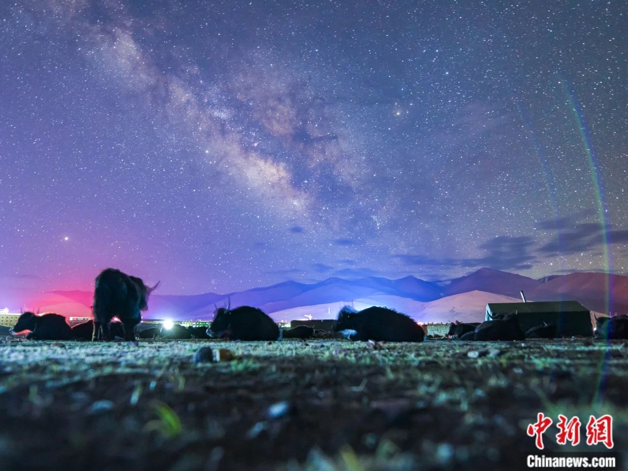2018年5月20日,西藏当雄草原上的牦牛群和天上的银河。中新社记者江飞波 摄