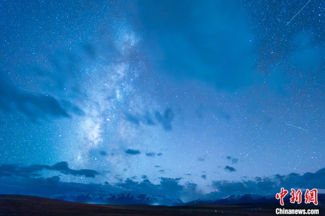 2022年12月14日晚,双子座流星雨划过拉萨河谷上空,画面右侧团状星云为银河。中新社记者江飞波 摄