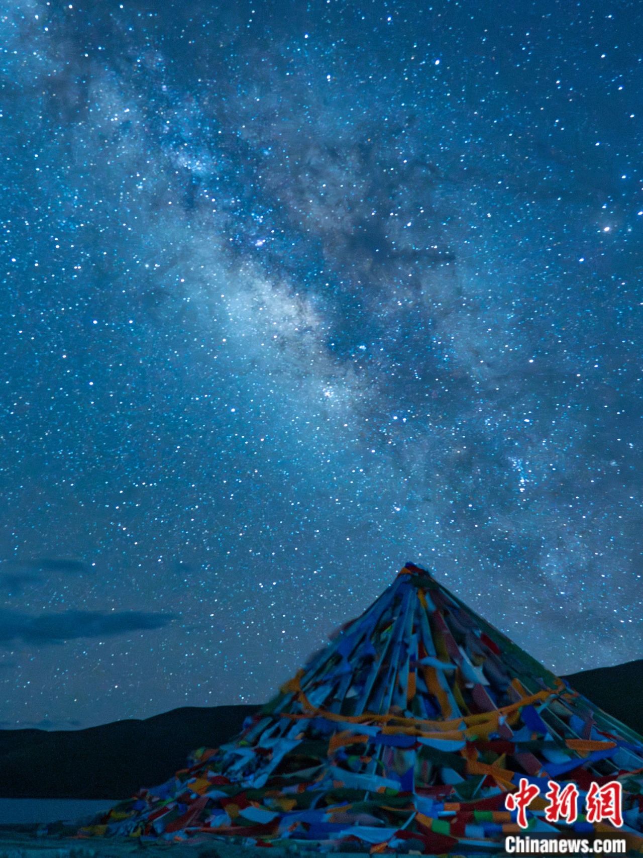 2022年7月17日,西藏羊卓雍错湖畔的经幡与天际的银河。中新社记者江飞波 摄