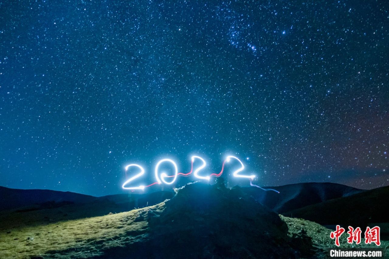 图为小新在西藏山南野外玩光绘摄影,在相机长曝光的时间里用手机灯光绘出“2022”字样。中新社记者江飞波 摄