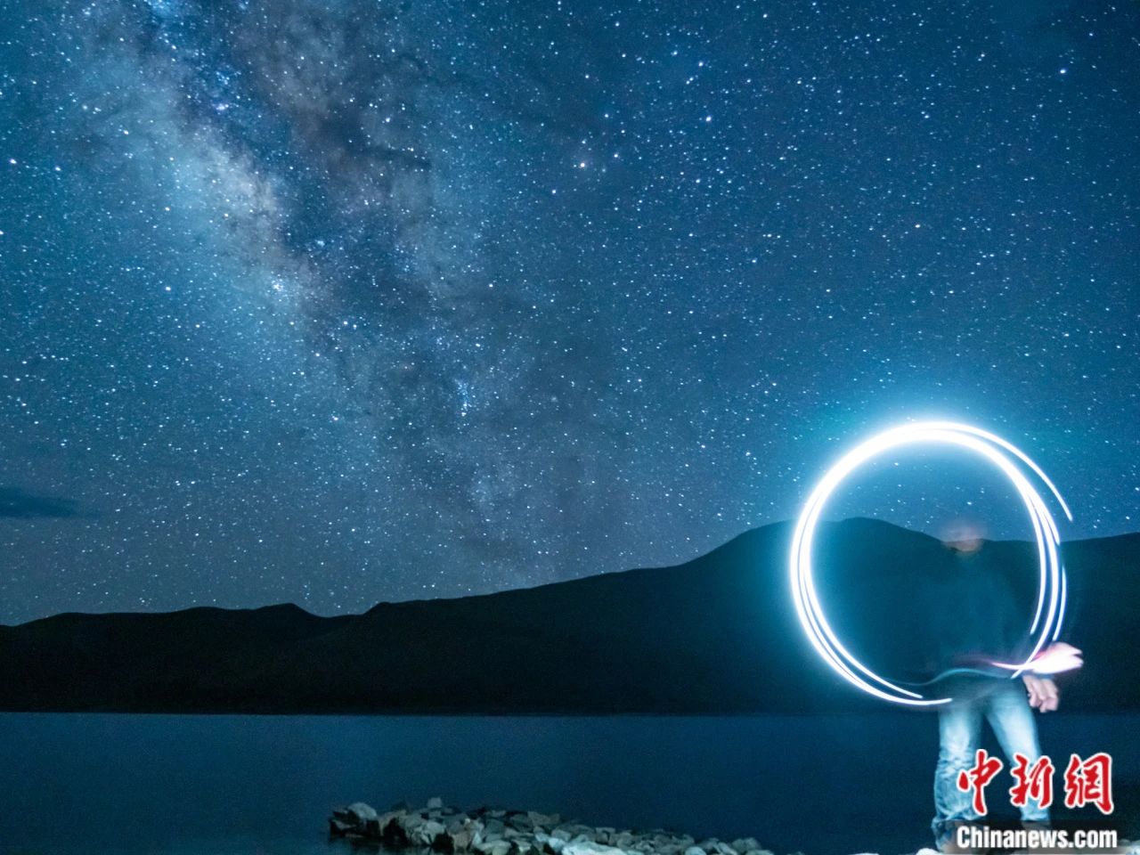 2022年7月17日,小新在西藏羊卓雍错湖畔与银河同框。中新社记者江飞波 摄