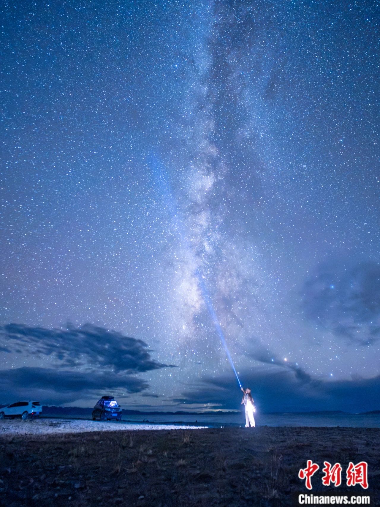 2024年10月1日晚,在西藏纳木错湖畔,小新邀请广东籍自驾游客当地景“模特”,拍摄游客与银河同框的画面。中新社记者江飞波 摄