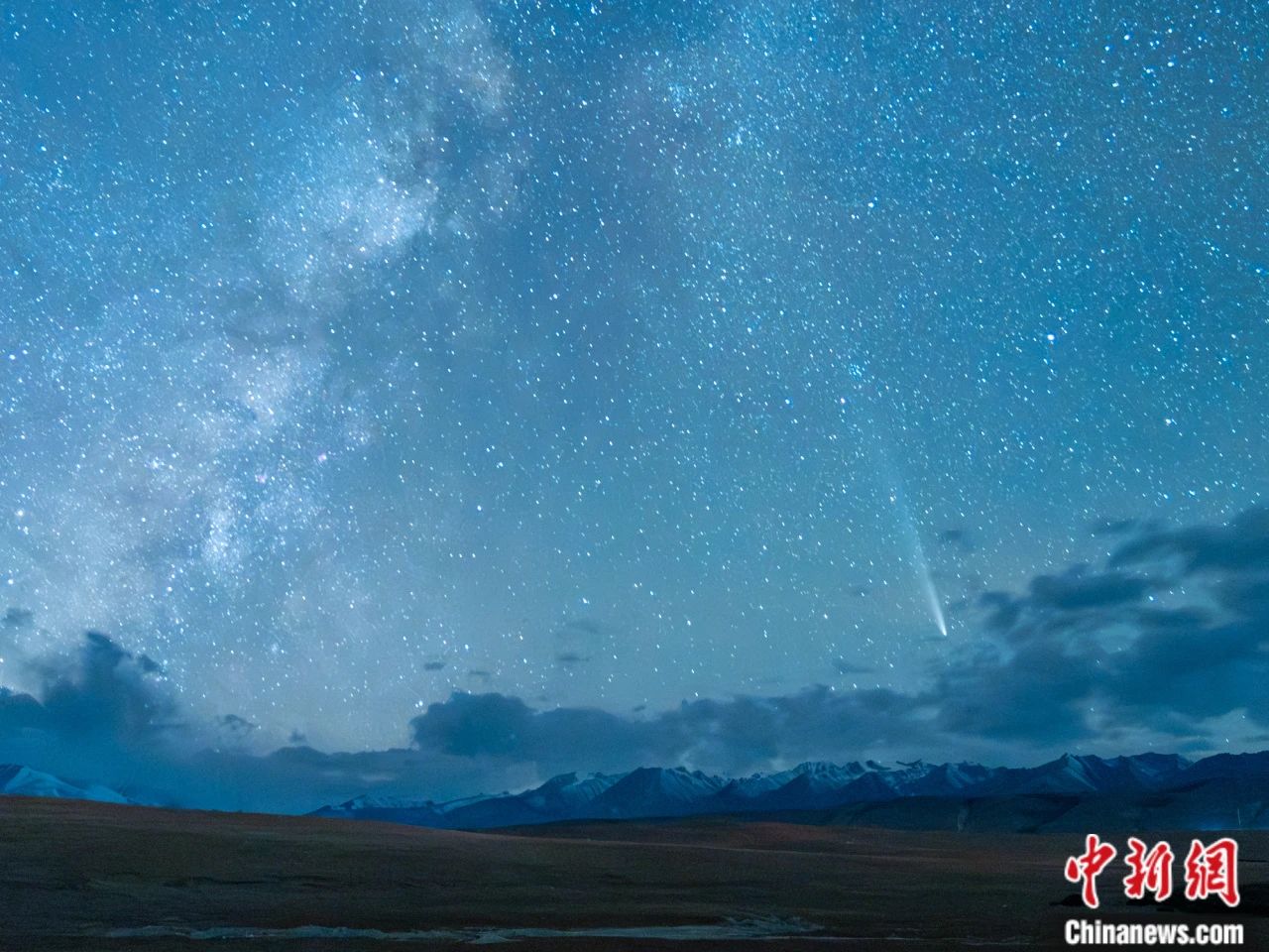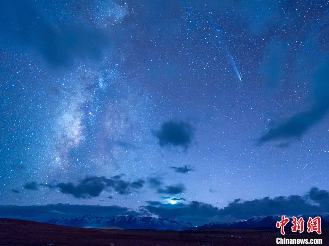 0月23日晚,西藏拉萨羊八井草原上,银河、紫金山—阿特拉斯彗星与金星(画面中下方)同框。中新社记者江飞波 摄
