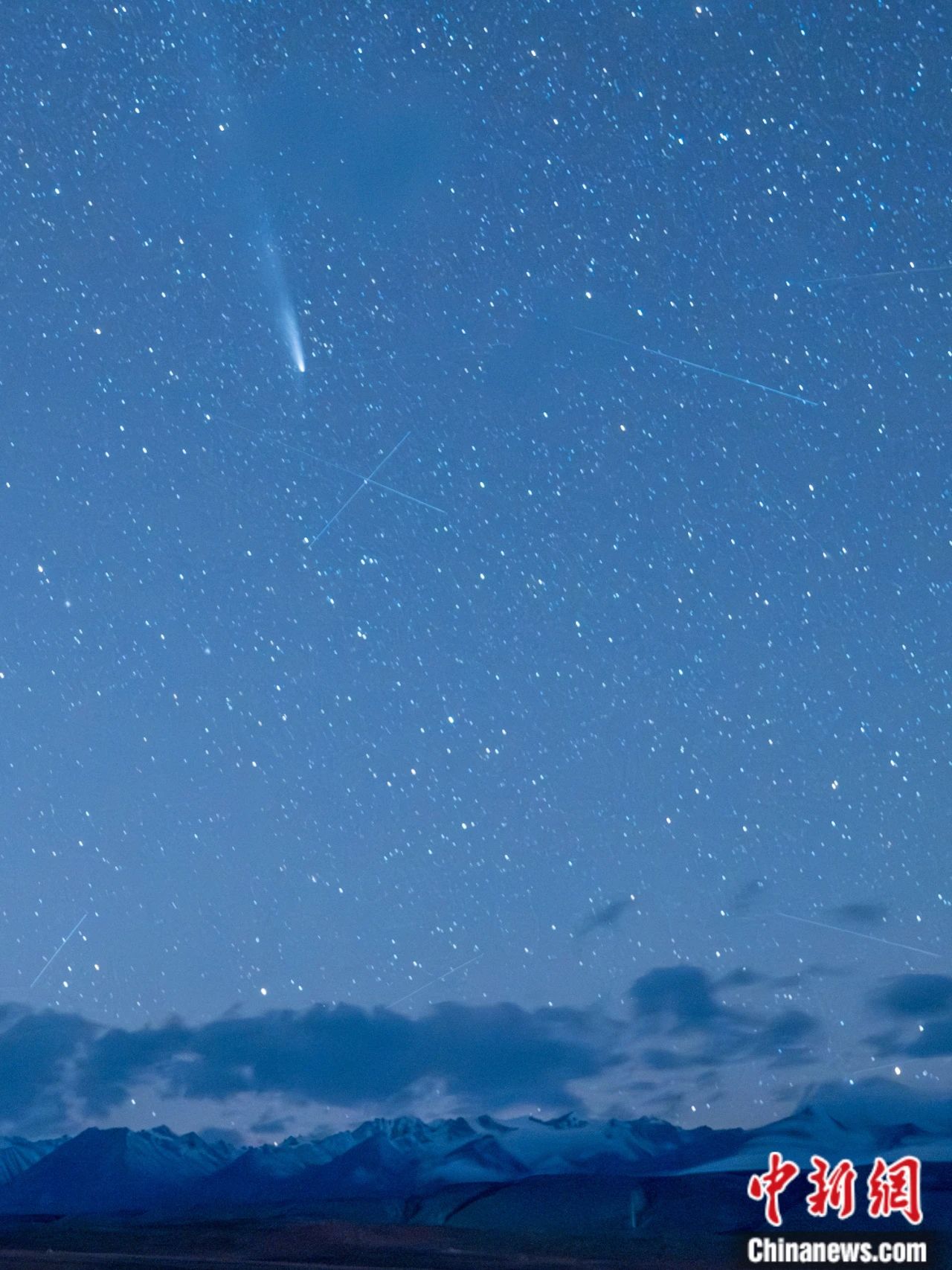 10月23日晚,紫金山—阿特拉斯彗星划过西藏拉萨羊八井雪山上空,画面中其它光线轨迹为卫星轨迹。中新社记者江飞波 摄