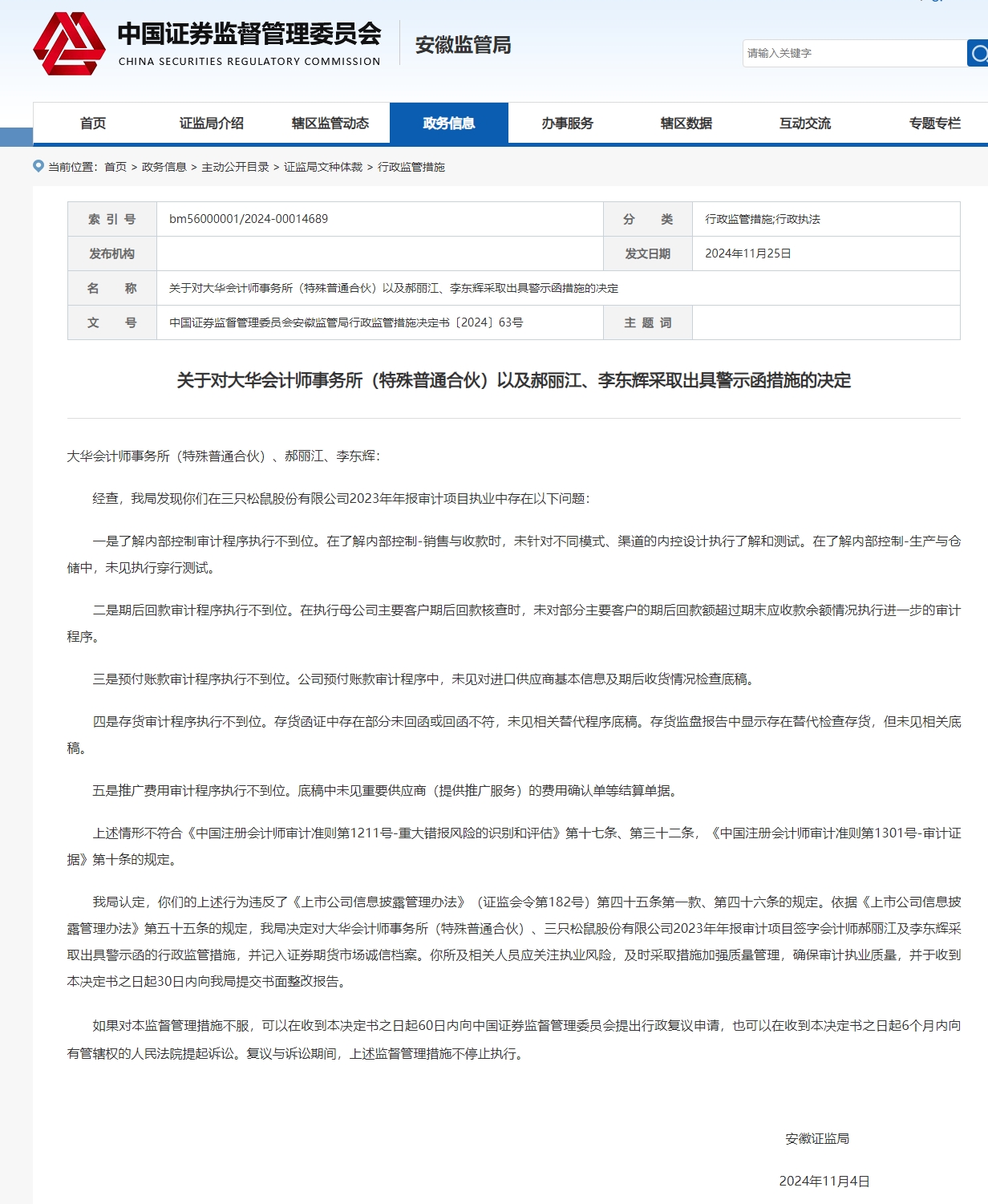 具体来看,经查,安徽证监局发现大华所、郝丽江、李东辉在三只松鼠股份有限公司2023年年报审计项目执业中存在以下问题: