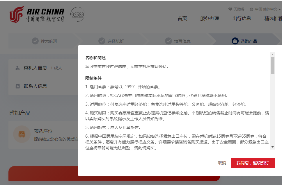 国航选座前弹出选座提示