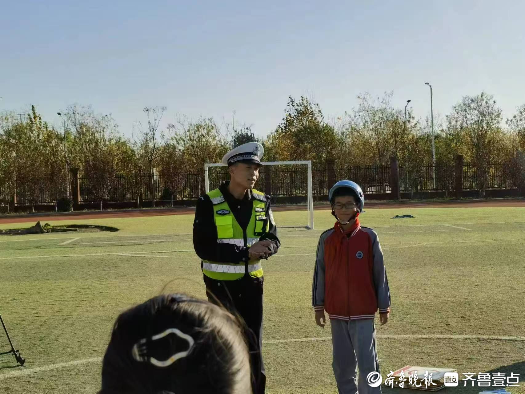 活动现场,围绕主题运用通俗易懂的语言,通过室内大课堂、户外实地模拟演练等形式开展。主要介绍一带一盔的重要性、以及关于安全骑行、认识汽车盲区、远离大货车、包括关于交通法规、认识交通标志等交通安全常识;组织学生在操场,由铁骑中队交警为孩子们面对面展示交通指挥手势,让孩子们对交通手势有了深刻的认识;带领学生到户外路口实地参与交通指挥,劝导交通违法行为,增强了同学们的学习乐趣和参与感。