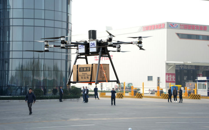 在临沂现代物流城,一架无人机在配送货物(2024年10月30日摄)。新华社记者 徐速绘 摄