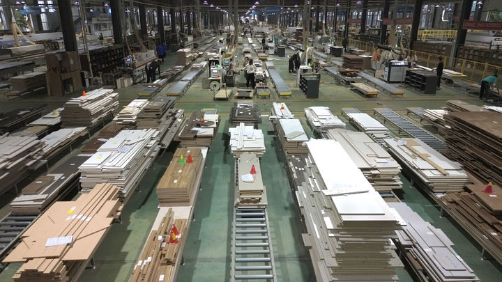 在曹县庄寨镇,工作人员在一家全屋定制家具生产企业的生产车间内工作(2024年9月19日摄)。新华社记者 徐速绘 摄