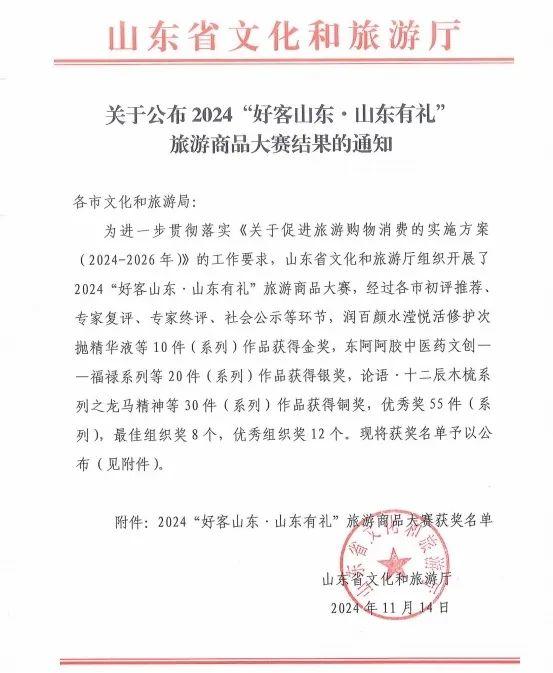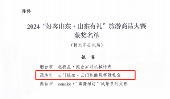 近日,由山东省文化和旅游厅主办,山东省旅游推广中心承办,山东省旅游行业协会协办的2024“好客山东·山东有礼”旅游商品大赛经过各市初评推荐、专家复评、专家终评、社会公示等环节,公布获奖结果。由云门酒业选送的“云门陈酿·风筝缘”礼盒,被评为2024“好客山东·山东有礼”旅游商品大赛银奖。