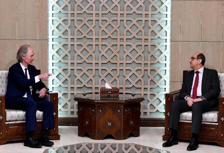 11月24日,在叙利亚大马士革,联合国秘书长叙利亚问题特使裴凯儒(左)与叙利亚外交和侨民事务部长萨巴格会晤。新华社发