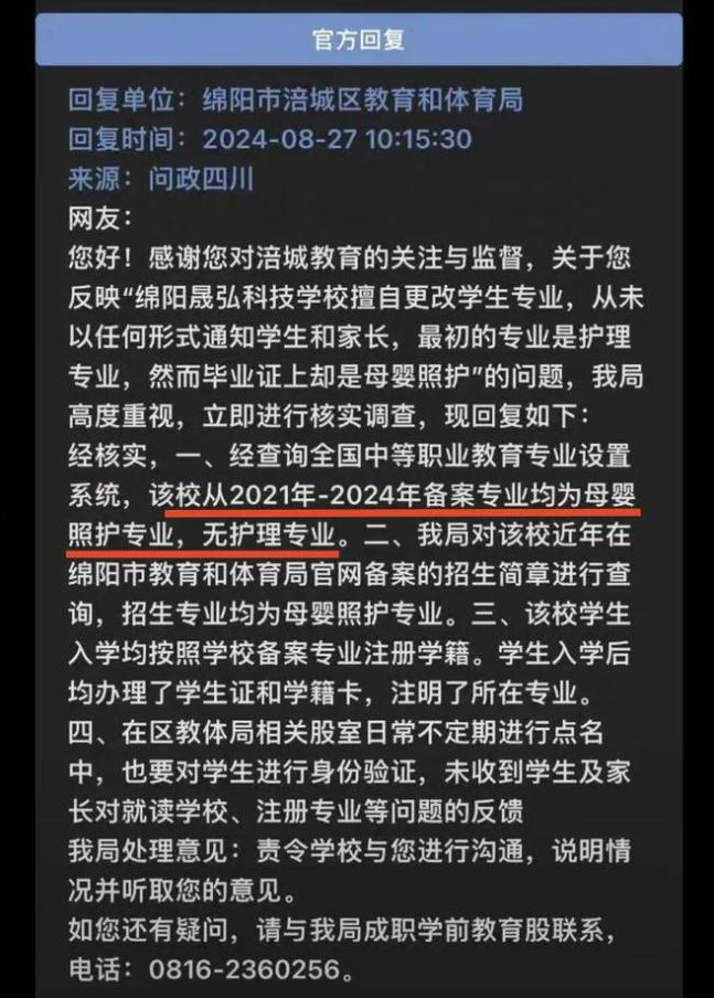 “入学通知书的专业是‘护理(升学班)’,毕业证上却是‘母婴照护’……”近日,四川绵阳市晟弘科技职业技术学校(以下简称“绵阳晟弘学校”)2021级的多名学生及家长反映,入学就读三年后,毕业证上的专业与入学专业不符,导致无法报考护士资格证。12月2日,记者从绵阳市涪城区教育和体育局获悉,接到反映后,涪城区委、区政府迅速成立处置工作专班,各工作组进驻学校调查处置,调查取证等相关工作正在依法依规进行,坚决维护学生、家长合法权益。