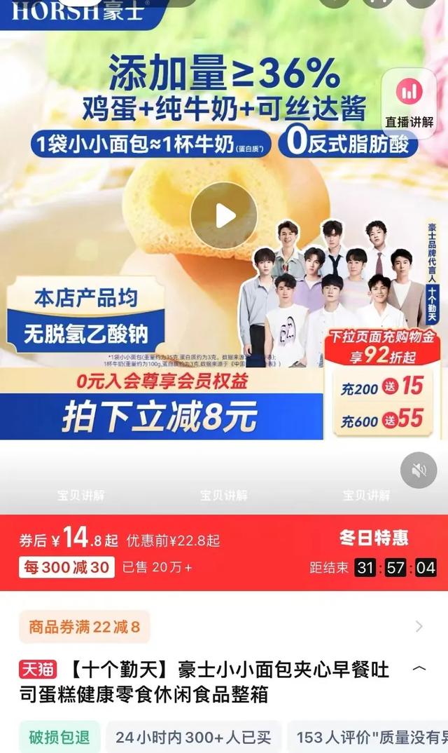 目前,豪士小小面包仍在其旗舰店售卖,售价为22.8元/箱,折后为14.8元/箱,目前已售出超过20万箱。商品详情页信息显示,豪士小小面包全网累计销量超过1660万袋。