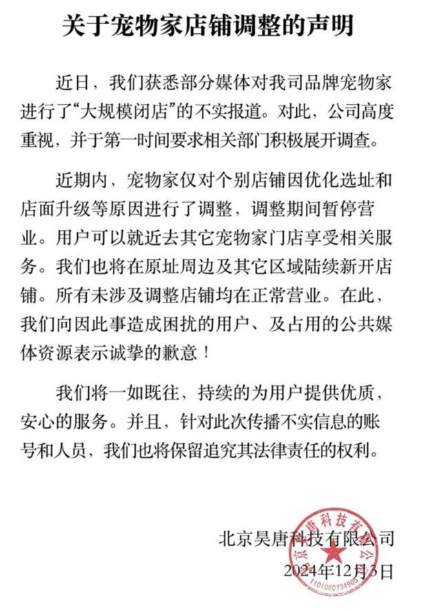 宠物家回应大规模闭店潮:仅个别店铺调整 环球网 2024-12-04 5531 12月4日消息,宠物家就“宠物家陷入大规模闭店潮”发布官方声明称,此为不实消息,今年以来,仅有个别店铺因为翻新和房租到期等相关原因进行了调整,调整期间暂时停止营业,用户可以就近去宠物家其他店铺享受相关服务。 官方称,宠物家将会在闭店门店的原址周边以及新址陆续新开店铺,其他未调整店铺都在正常营业。目前宠物家已拥有全国直营护理型门店近200家,年提供超200万只次护理服务。 责任编辑:消费频道张妍
