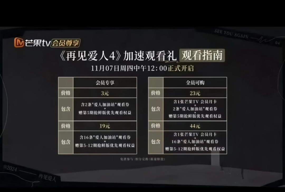 值得注意的是,《再见爱人4》更新到第五期时,芒果TV上线了一款新产品:30分钟抢鲜版,于每周五提前播出下期正片部分内容。若要同步观看这一版本,则需要在会员(含超级会员)的基础上再花3元进行解锁,或直接19元购买打包版。