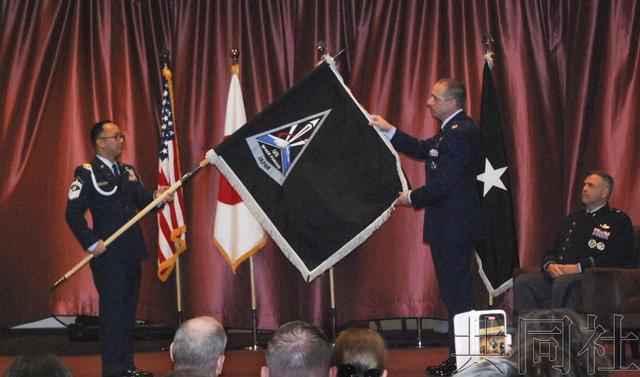 △12月4日,驻日美军在横田基地(东京)展示“美国驻日太空军”旗帜(图源:共同社)